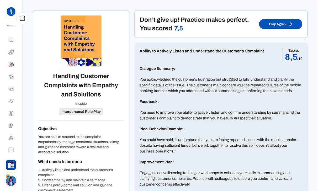 Equip employees to step into realistic business scenarios, practice critical conversations with AI, and receive instant scoring with personalized feedback for deliberate practice.